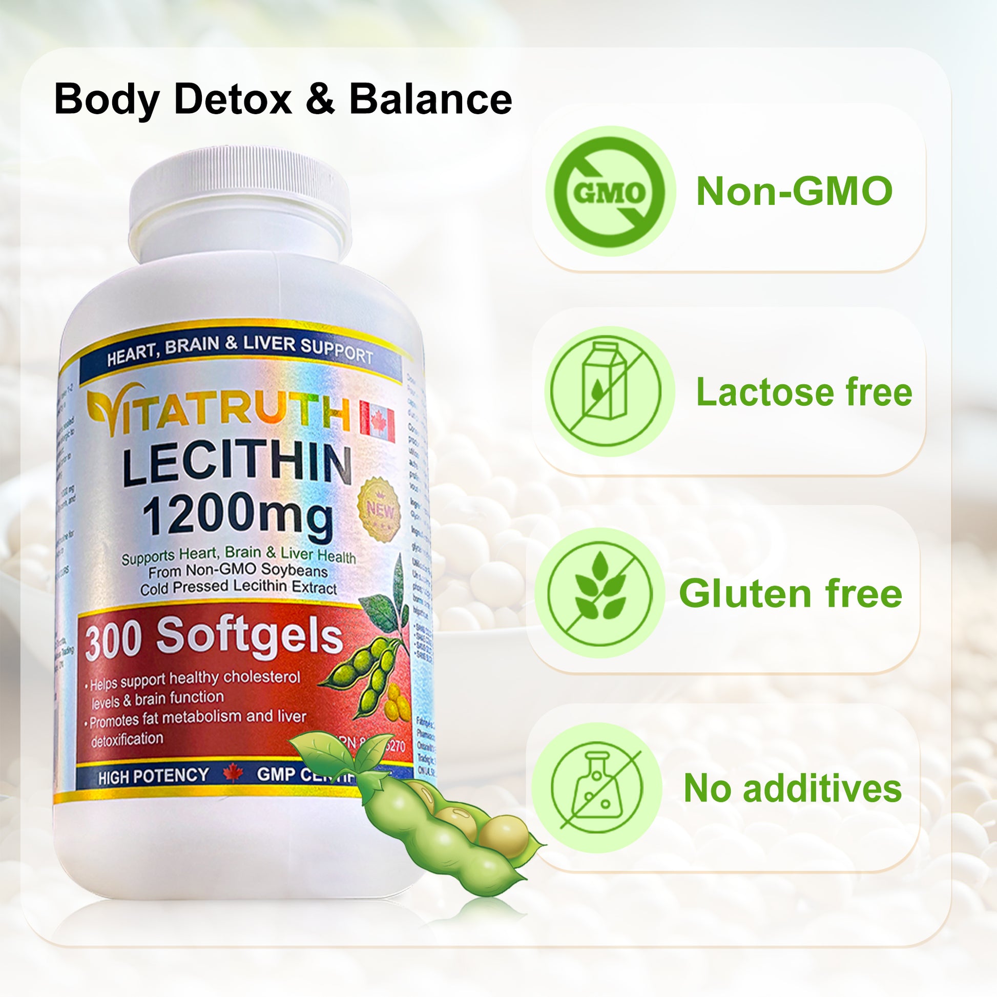 Vitatruth Lecithin 1200mg – Support Brain, Liver & Heart Health Vitatruth Lecithin is a premium dietary supplement derived from non-GMO soybeans, providing 1,200 mg of natural phospholipids per softgel. Lecithin plays a vital role in maintaining healthy cell membranes and promoting overall wellness. Formulated in Canada under GMP-certified facilities, each softgel delivers consistent purity and potency you can trust.